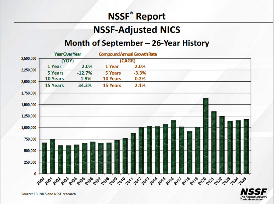 For comparison, the unadjusted September 2025 FBI NICS figure of 1,858,763 reflects a 10.3% percent decrease from the unadjusted FBI NICS figure of 2,072,550 in September 2024.