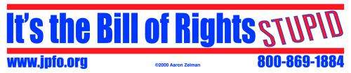 JPFO has a new bumper sticker called "It's the Bill of Rights, Stupid!". The sticker is white with red and blue letters.